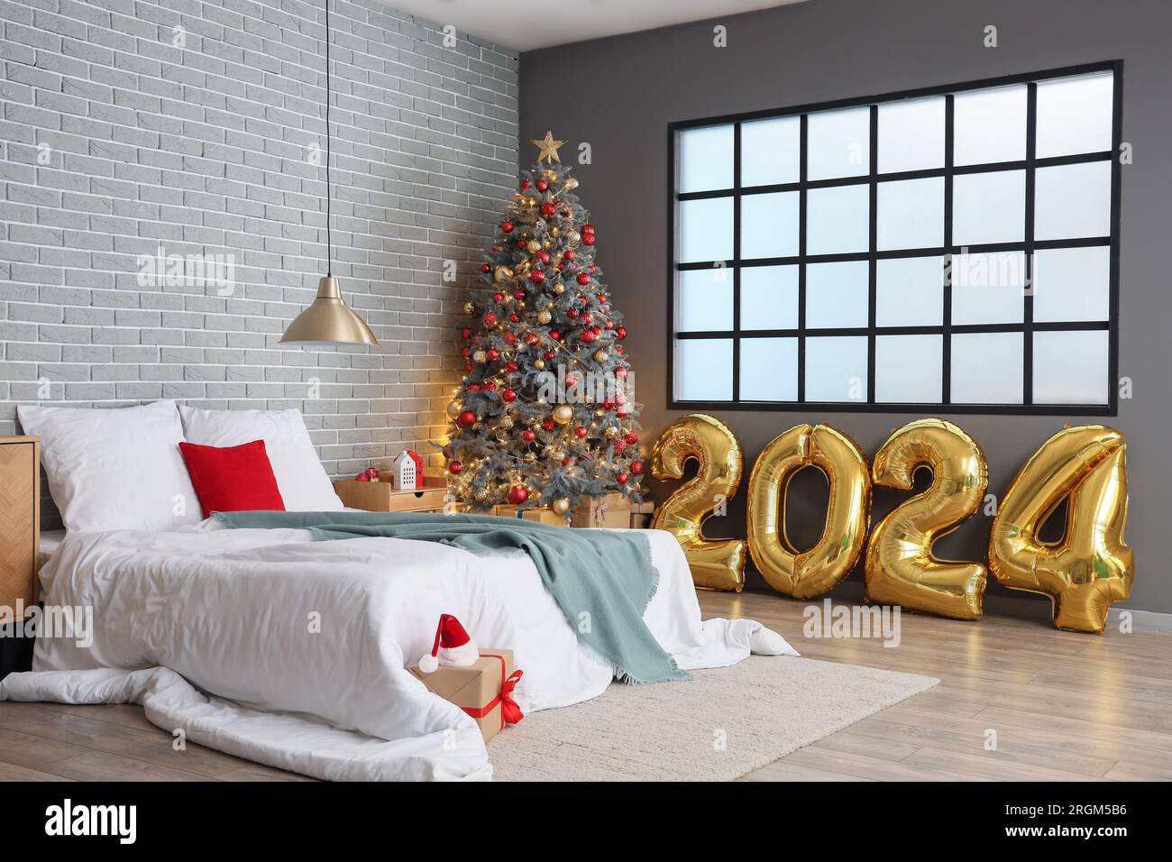 Ballons in Form von Figur 2024 in festlichem Schlafzimmer mit